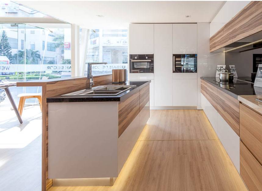 Tủ bếp gỗ công nghiệp MFC, MDF, HDF…đón nhận sử dụng rộng rãi trong các căn hộ chung cư, nhà phố, biệt thự hiện đại, với sự kết hợp giữa các phụ kiện như: các loại kệ đựng đa dụng bên trong tủ bếp, hộp đựng gạo có chức năng lấy gạo tự động, các loại tủ chứa đồ khô, chai lọ, dao, muỗng nĩa …. tao nên sự hiện đại và tiện nghi cho chiếc tủ bếp nhà bạn.